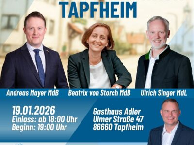 Wahlkampfauftakt im Donau-Ries mit Beatrix von Storch, Andreas Mayer und Ulrich Singer. Wann: Montag, 19.01.26 Wo: Gasthaus Adler, Ulmer Straße 44, 86660 Tapfheim Beginn: 19:00 Uhr